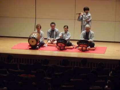 今日は、5年生が教科「日本語」の学習の一環で、ふれあいホールにて「野良田囃子」を鑑賞しました。中町の地域に古くから伝わるお囃子だそうです。笛・太鼓・鐘の心地よい音色と伝統を繫いできた人々の思いを学びとった子どもたちでした。