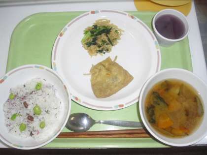 今日の献立は、萩ごはん、牛乳、福袋煮、小松菜と切干しのハリハリ漬け、田舎汁、ぶどうゼリーです。小豆を萩の花、えだ豆を萩の葉に見立てたごはんをつくりました。