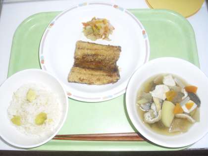 今日のこんだては、栗ご飯、牛乳、サンマのかば焼き、野菜の菊花あえ、けんちんじるです。食用菊を野菜のあえものに使用しました。