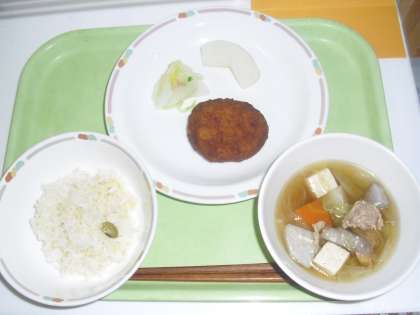 今日の献立は、五穀ごはん、牛乳、ゼリーフライ、白菜の浅漬け、いものこ汁、梨です。ゼリーフライは、埼玉県行田市の料理です。銭フライがなまって、ゼリーフライになりました。