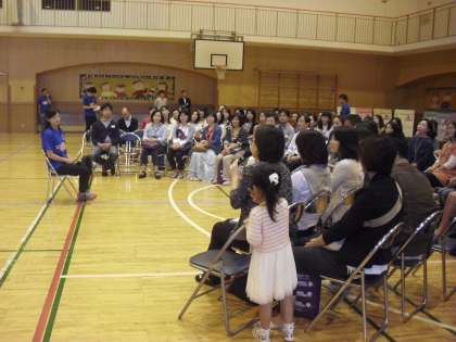 バルセロナ五輪金メダリストである、岩崎恭子さんが来校し、子どもたちの質問に応えたり、一緒に水泳が上手になる体操をしたりと盛り上がりました。小さくても目標を立て努力を続けること、あいさつの大切さなどについて、わかりやすく気さくにお話しをしていただきました。保護者・地域の方とも懇談会が行われ、しつけや子育てについて、交流できました。子どもたちの全校合唱による「あいさつは魔法の力」の歌声に感動していた岩崎さん。「中町小学校はよい学校ですね。」とうれしい言葉もいただきました。