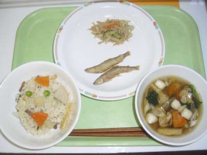 今日の献立は、里いもごはん、牛乳、わかさぎのから揚げ、野菜のゴマ酢かけ、のっぺい汁です。里いもをたっぷり入れた炊き込みごはんをつくりました。