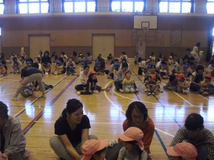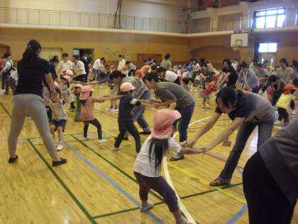 19日。中町小学校の体育館で、中町幼稚園の全園児と保護者の方が親子体操教室を楽しみました。中町幼稚園は、今年、世田谷区3快プログラム 〜快眠・快食・快運動〜 心と体の元気アップ!!の『幼児教育』実践モデル園で、先行実践として行われました。