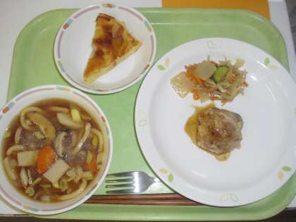 今日の献立は、みそ煮込みうどん、牛乳、蒸しどり、こんにゃくサラダ、ヨーグルトポムポムです。ヨーグルトポムポムはヨーグルトとりんごのケーキです。