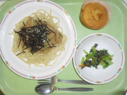今日の給食は、牛乳、大根おろしスパゲッティ、ワカメ入りおひたし、かぼちゃのマフィンです。