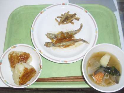 11月8日はいいはの日です。今日もよく噛んで食べるメニューです。献立は、焼きおにぎり、牛乳、ししやもの南蛮漬け、かみかみごぼう、田舎汁です。