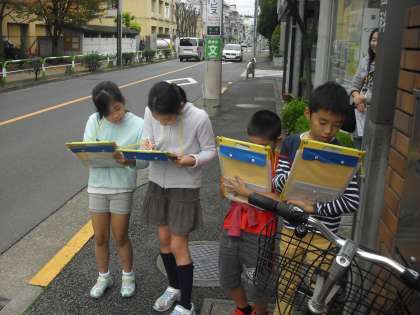 11月18日、4年生の子どもたちが、みどりのレンジャーさんと保護者の方の協力をいただきながら、中町小学校の学区域内の安全を調べました。子どもにとっては、なんということもない段差も、高齢者の方や障がいのある方にとっては、危険な箇所になりえます。だれにとっても住みやすい中町をめざして安全マップを作っていきます。