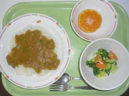 今日の献立は、牛乳、キーマカレーライス、ブロッコリーのミモザサラダ、菊花みかんです。