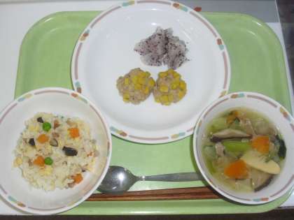 早いもので今日で11月は終わりです。今年も残り1か月となりました。今日の献立はチャーハン、牛乳、にくだんごのコーン蒸し、大根のゆかりかけ、中華スープです。
