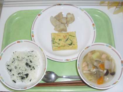 今日の献立は、わかめごはん、牛乳、五目卵焼き。里いものごまみそ煮、石狩汁です。