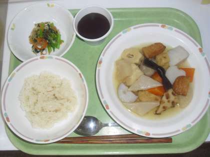 今日の献立は、茶めし、牛乳、おでん、野菜のごまあえ、水ようかんです。福井県では、水ようかんを冬になってから食べます。
