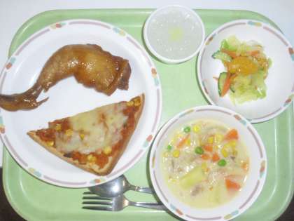 今日の給食は、牛乳、ピザトースト、クリスマスチキン、フレンチサラダ、コーンクリームスープ、キラキラゼリーです。