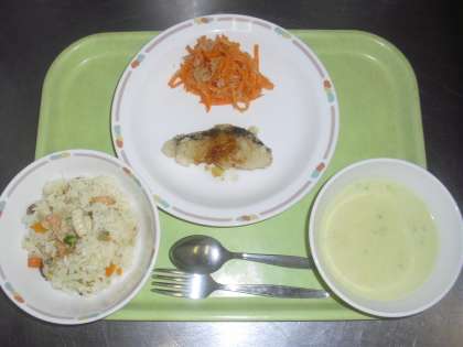 今日の献立は、シーフードピラフ、牛乳、ホキのステーキソースかけ、にんじんのラペ、さつまいものポタージュです。さつまいもをゆでてミキサーでピューレにしてポタージュにしました。