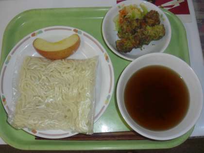 今日の献立は、ソフト麺のつけめん、牛乳、竹輪の磯部揚げ、塩もみ野菜、りんごです。1月24日は学校給食記念日なので、今日は昭和40年代前後の給食メニューを出しました。