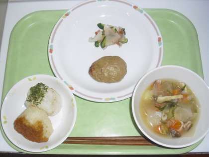 今日の献立は、おかかのおにぎり、焼きおにぎり、牛乳、飛び魚のさんが焼き、大根のさっぱりづけ、豚汁です。さんが焼きは飛び魚のすり身と豆腐をみそで味付けして、オーブンで焼きました。