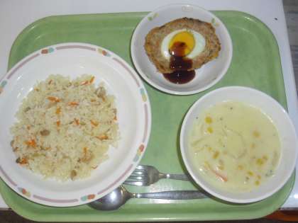 今日の献立は、とりごぼうピラフ、牛乳、スコッチエッグ、コーンポタージュです。スコッチエッグは、ゆで卵をひき肉で包みパン粉をつけて揚げました。