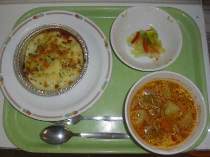 今日の献立は、ドリア、牛乳、ボルシチ、野菜のマリネです。野菜のマリネは、春キャベツ、にんじん、パプリカが入っています。