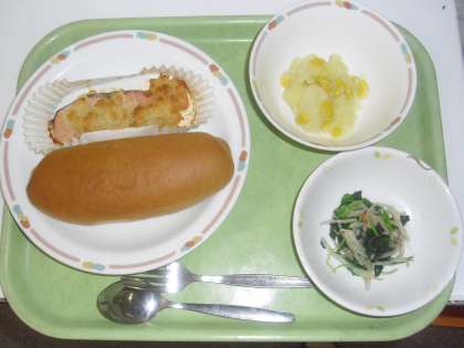 今日の献立は、黒砂糖パン、牛乳、鮭のガーリック焼き、コーンポテト、ほうれん草のソテーです。鮭に、にんにく、レモン、ワイン、マヨネーズとパン粉を混ぜたものを乗せて、オーブンで焼きました。