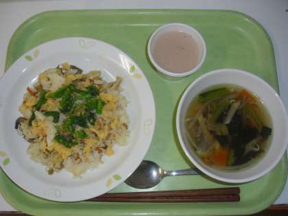 今日はひな祭りです。今日の献立は、菜の花ずし、牛乳、沢煮椀、いちごゼリーです。いちごゼリーは生のいちごをミキサーでピューレにして、ゼリーにしました。