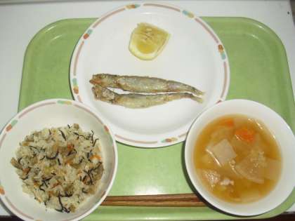 今日の献立は、ひじきごはん、牛乳、ししゃものから揚げ、呉汁、はるかです。