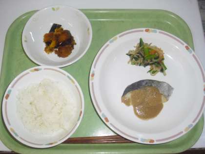 今日の献立は、ごはん、牛乳、鰆のごまみそかけ、青菜のおひたし、かぼちゃの揚げ煮です。鰆は春告げ魚と言われています。