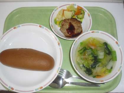 今日の献立は、ココアパン、牛乳、ハンバーグ、ポテト入りフレンチサラダ、野菜スープです。じゃがいもをゆでて野菜とフレンチドレッシングで味付けしました。