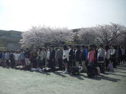 晴れわたる空と満開の桜の花の下、始業式が行われました。新しい学年に進級し、意欲満々の子どもたちでした。どのクラスもいいクラスをつくっていきましょう。