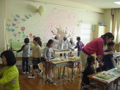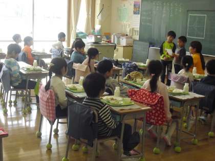 11日。1年生にとって初めての給食が始まりました。給食当番の白衣姿もりりしく、配膳の仕事をがんばっていました。待っている姿勢も約束を守って、静かに待てていました。立派でした。中町小の給食はおいしいので、明日も楽しみですね。