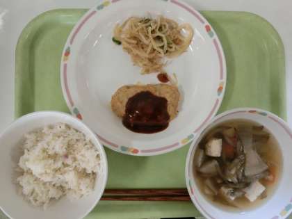 今日の献立は、牛乳、桜ごはん、チキンハンバーグ、ごま酢かけ、けんちん汁です。