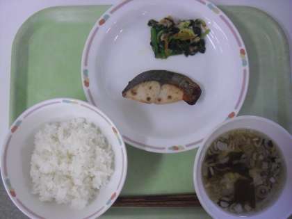 今日の献立は、牛乳、ごはん、魚の西京焼き、野菜のおかかかけ、すまし汁です。