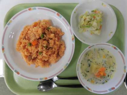 今日の献立は、牛乳、チキンライス、ポテトスープ、キャベツサラダです。