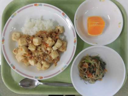 今日の献立は、牛乳、麻婆豆腐丼、ナムル、オレンジです。