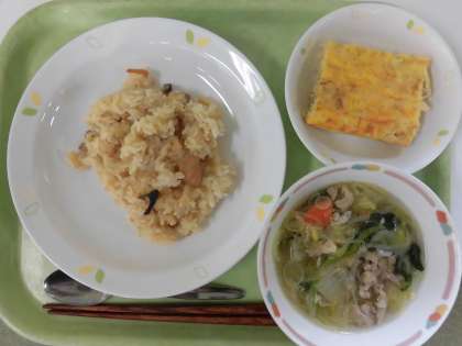 5月2日の献立は、牛乳、中華おこわ、切干し大根の卵焼き、中華スープです。