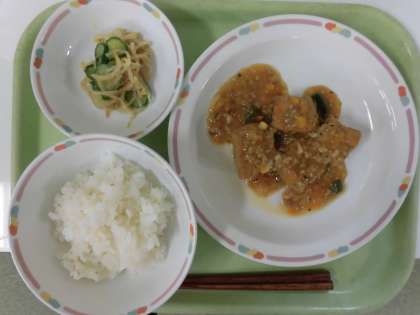 今日の献立は、牛乳、ごはん、生揚げそぼろあんかけ、ごま酢かけです。