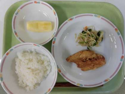 今日の献立は、牛乳、ごはん、魚の竜田揚げ、野菜のからしじょうゆかけ、りんごです。