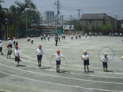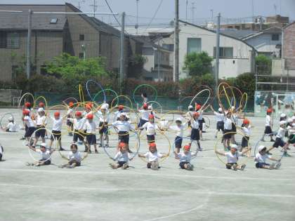 1年生はフラフープを使った表現運動を披露します。笑顔で楽しんで表現する様子を楽しみにしていてください。