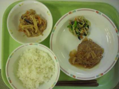 今日の献立は、牛乳、ごはん、むろあじバーグ、青菜のおひたし、切り干し大根の煮つけです。