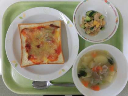 今日の献立は、牛乳、ピザトースト、ビーンズサラダ、ベーコンと野菜のスープです。