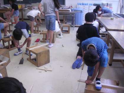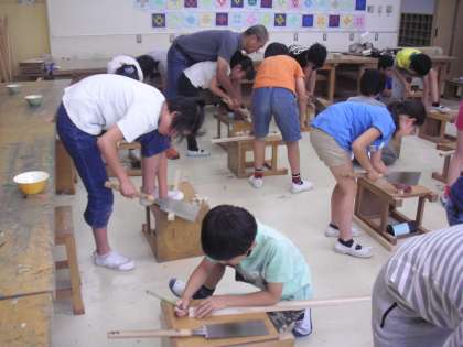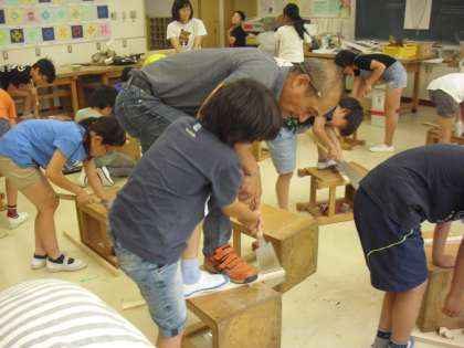 2日。4年生は図工の授業で、石井さんという講師の方をお招きし、のこぎりの扱い方を学びました。のこぎりの刃の違いを教えていただいた後、早速、木材を切ります。1本の木材から、縦長やななめなど自分のほしい形に木材を切っていきます。その真剣なまなざし、姿勢はとてもかっこよかったです。