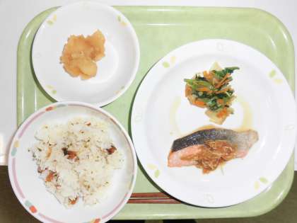 今日の献立は、牛乳、豆ごはん、魚の南蛮焼き、野菜のおかかかけ、じゃがいもの甘辛煮です。