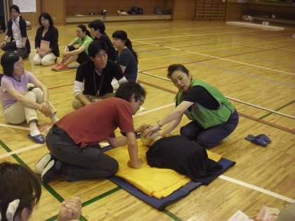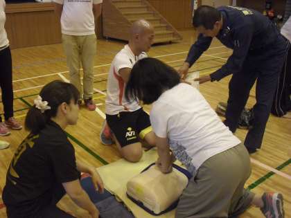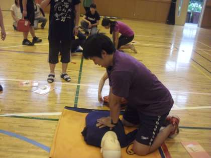 8日。玉川消防署の方をお招きして救急救命法を、中町小学校・玉川小学校・中町幼稚園の先生方が学びました。水泳指導が始まる前に毎年行っている研修です。来週から水泳指導が始まりますが、安全第一で行います。