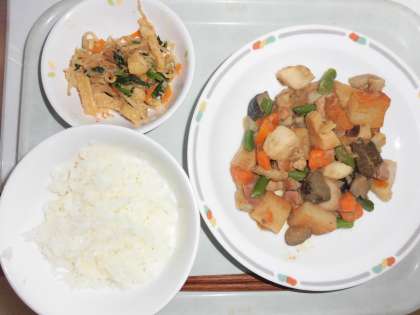 今日の献立は、牛乳、ごはん、いりどり煮、カリカリ油揚げと野菜のひたしです。