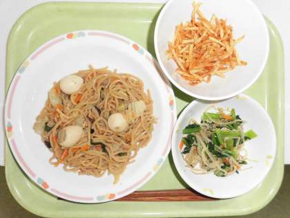 今日の献立は、牛乳、五目焼きそば、ナムル、フライドポテトです。