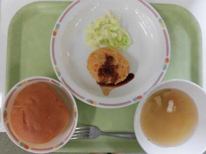 今日の献立は、牛乳、ミルクパン、コロッケ、ゆでキャベツ、コンソメスープです。