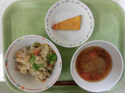 今日の給食は、牛乳、磯おこわ、いかの照り焼き、呉汁です。