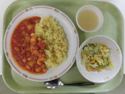 今日の献立は、牛乳、チリビーンズライス、コーン入りフレンチサラダ、りんごゼリーです。