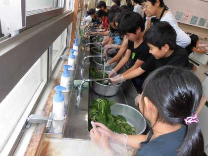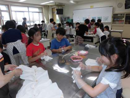 「草木染め教室」では、森の児童館でも教えていらっしゃる地域の方が講師です。地域の方が大勢お手伝いに来てくださって本当にありがたいです。いつもはできない貴重な体験ができ、涼しげな色合いのシルクのハンカチのおみやげに満足げな子どもたちです。