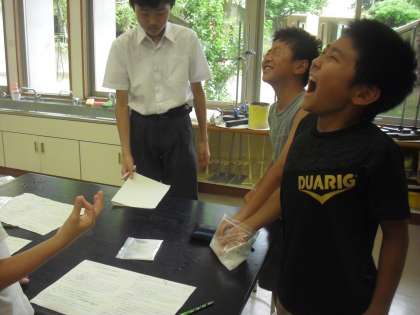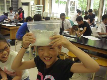 長かった梅雨もようやく明けた28日。一気に暑くなり、わくわく実験教室(高学年)の「ひんやり」をつくる実験に子どもたちは大興奮でした。高学年の子どもたちは、ラムネと冷えカイロを作りました。身の回りにあるものを使い、化学反応を利用することで生活に役立つものが多くあることに感心した子どもたちでした。