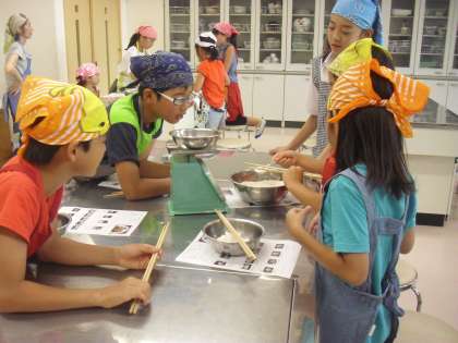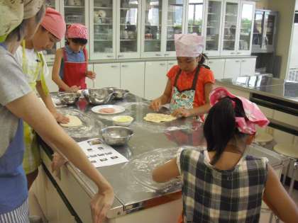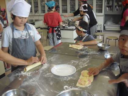 午前中の水泳指導も終わり、空を見上げると怪しげな黒い雲が。雨にならなければいいなと案じていたら、激しい雨が降ってきて川門付近は歩けないほどです。そんな天候の中、子どもたちが来てくれました。今日はフライパンでつくるパン作り教室です。粉を量り、生地をこね、ハムとチーズを挟み込んで、フライパンで焼きます。焼いているうちに、雨も上がり、一安心。家でも作ってくれると大助かりです。