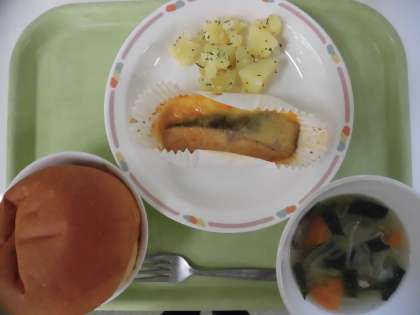 今日の献立は、ミルクパン、魚のチーズ焼き、パセリポテト、野菜のスープです。